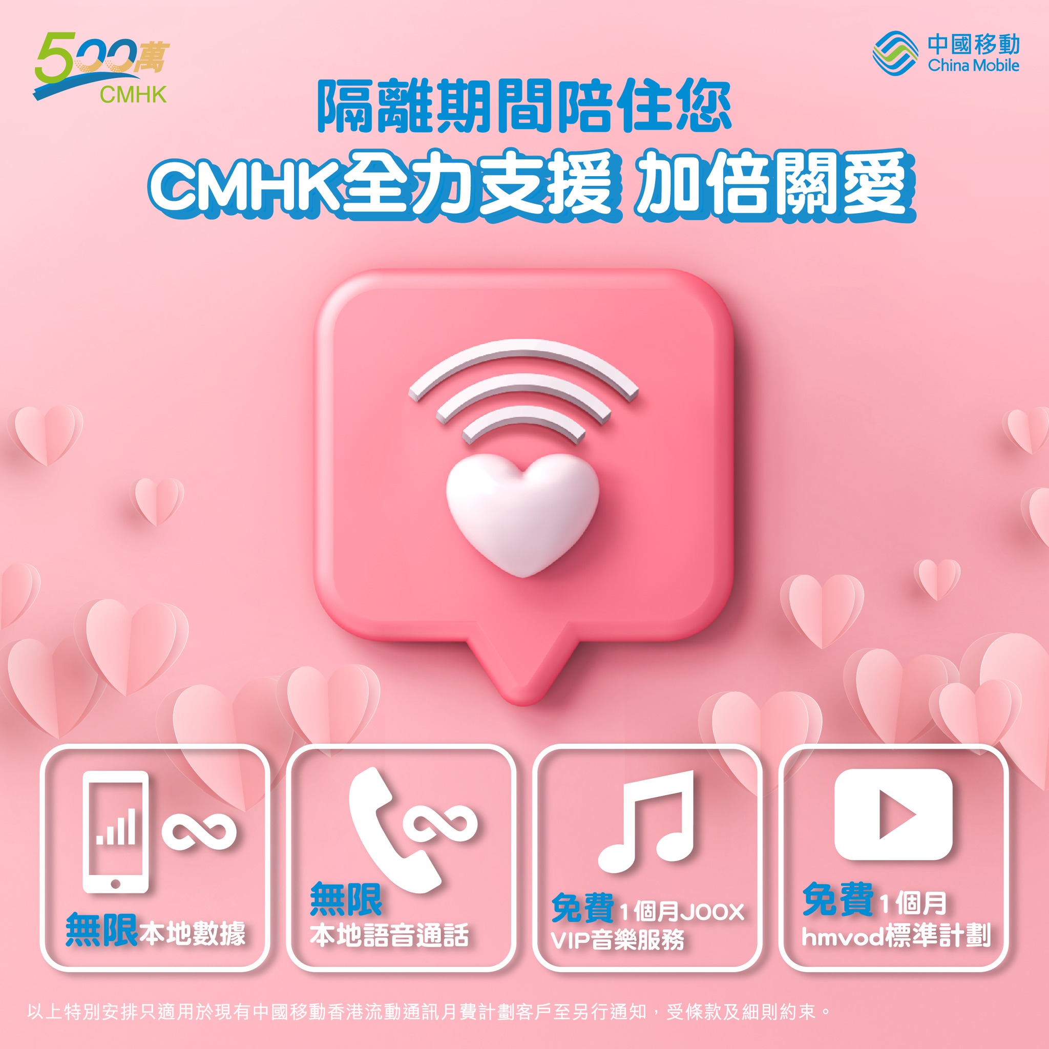 China Mobile Hong Kong (CMHK) vede i residenti di Yat Kwai House e Ying Kwai House nel villaggio di Kwai Chung che devono mettersi in quarantena a casa, CMHK ha immediatamente annunciato la fornitura di dati locali illimitati gratuiti e servizi di chiamata vocale; Servizio musicale JOOX VIP gratuito per 1 mese e hmvod standard per film misti, nessuna garanzia di fermo macchina durante la quarantena. La disposizione di cui sopra si applica anche ai clienti di qualsiasi piano di servizio che devono essere messi in quarantena in un centro di quarantena, in modo che i clienti bisognosi possano rimanere in contatto con il mondo esterno durante il periodo di quarantena e rimanere in contatto con il mondo esterno.