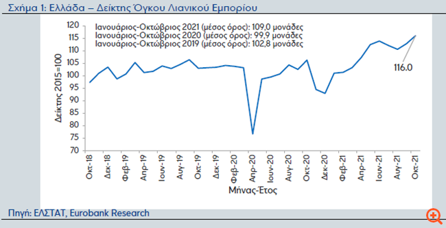 Eurobank Research discute gli effetti positivi delle vendite al dettaglio e i messaggi incoraggianti del settore manifatturiero nella sua ultima pubblicazione “7 Days Economy”, sebbene avverta dei rischi di una pandemia e di una crisi energetica.