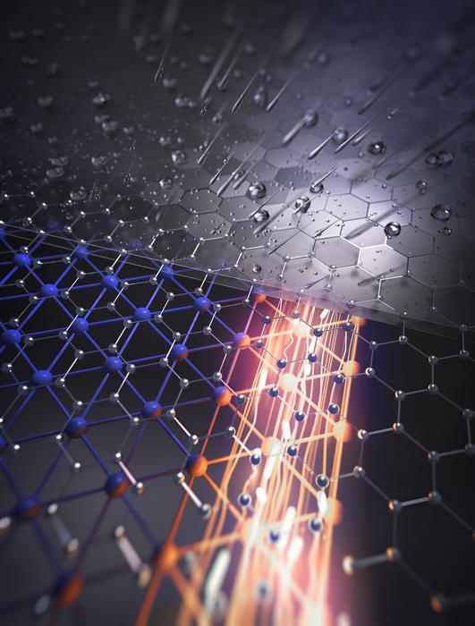 Una rappresentazione schematica di come lo strato di grafene protegge dall'acqua. La corrente elettrica che scorre lungo il bordo dell'isolante topologico indenino rimane completamente insensibile agli influssi esterni.
