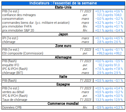 In Eurozona (19)Il PIL è aumentato del +0,1% nel 1Qualunque Trimestre 2023 (dopo -0,0%) L’indice del clima economico ESI è leggermente aumentato ad aprile (99,3 dopo 99,2 di marzo). In GermaniaIl PIL è rimasto fermo a 1Qualunque Trimestre 2023 (+0,0% dopo −0,5%). Ad aprile l’IFO Business Climate Survey è migliorata (92,2 dopo 91,0 di marzo) e l’inflazione è diminuita (+7,6% dopo +7,8%). Il tasso di disoccupazione è rimasto stabile al 2,9% a marzo. Il PIL aumenta di 1Qualunque Trimestre 2023 In Italia (+0,5% dopo -0,1%) as In Spagna (+0,5% dopo il +0,4%), visto che anche il tasso di disoccupazione è salito al 13,3%, dopo il 12,9% del 4H Trimestre 2022. Inoltre, le vendite al dettaglio sono aumentate a marzo (+0,5% dopo -0,2%), così come l’IPC ad aprile (+3,8% dopo +3,0%). A stato unitoIl PIL è aumentato del +0,3% rispetto all’1Qualunque trimestre 2023 (dopo +0,6%). I consumi delle famiglie sono nuovamente diminuiti a marzo (0,0% dopo -0,1%) e la fiducia delle famiglie è peggiorata ad aprile (101,3 dopo 104,0). Gli ordini di beni durevoli sono aumentati a marzo (+3,2%, dopo il -1,2%). A febbraio i prezzi degli immobili sono aumentati dello 0,1% nelle 20 maggiori città del Paese secondo l’S&P (dopo il -0,4%) e dello 0,5% a livello nazionale secondo l’indice. Agenzia federale per il finanziamento degli alloggi (dopo +0,1%). In GiapponeLa produzione industriale è aumentata a marzo (+0,1% dopo +4,5%), così come il tasso di disoccupazione (2,8% dopo +2,5%). Infine il commercio mondiale nelle materie prime a febbraio (-0,9% dopo il +0,3% di gennaio).