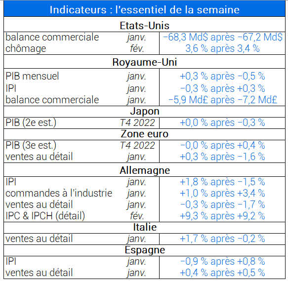 In EurozonaIl PIL è rimasto stabile a 4H Trimestre 2022 (3H stima), a -0,0% dopo un +0,4% in 3H un quarto. Le vendite al dettaglio sono aumentate del +0,3% a gennaio 2023 (dopo il -1,7% di dicembre 2022) e sono rimaste in calo del -2,3% su base annua. In GermaniaLa produzione industriale è rimbalzata del +1,8% a gennaio, dopo essere scesa del -1,4% a dicembre, mentre gli ordini industriali sono tornati a salire, +1,0% a gennaio dopo il +3,4% di dicembre. A gennaio, invece, le vendite al dettaglio oltre Reno sono nuovamente diminuite del -0,3% (dopo il -1,7% di dicembre) mentre sono aumentate del +1,7% in Italia (dopo -0,2%) e +0,4% a Spagna (dopo +0,5%). I prezzi al consumo in Germania sono aumentati del +9,3% a febbraio su base annua, dopo il +9,2% di gennaio, secondo la stima finale. La produzione industriale spagnola è scesa del -0,9% a gennaio, dopo il +0,8% di dicembre. A stato unitoIl tasso di disoccupazione è salito al 3,6% a febbraio (dopo il -3,4% di gennaio) e il deficit commerciale è peggiorato a -68,3 miliardi di dollari a gennaio (dopo i -67,2 miliardi di dollari a dicembre). In Regno UnitoIl PIL mensile è cresciuto del +0,3% a gennaio (dopo il -0,5% di dicembre), mentre la produzione industriale è scesa del -0,3% a gennaio (dopo il +0,3% di dicembre) ed è rimasta nettamente inferiore su base annua, del -4,3%. . Infine, il deficit commerciale si è ridotto a -5,9 miliardi di sterline a gennaio (dopo -7,2 miliardi di sterline a dicembre). In GiapponeIl PIL è rimasto stabile a 4H Trimestre 2022 (2nde stima), a +0,0% (rivisto di -0,2 punti rispetto a 1,0%).tempo stima) dopo essere sceso del -0,3% su 3H Trimestre 2022.