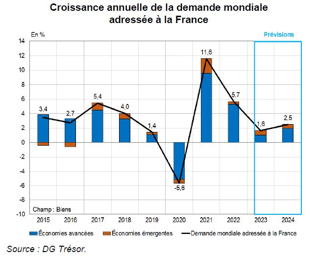 Il commercio mondiale dovrebbe rallentare bruscamente nel 2023 a causa della debole attività, per poi riprendere nel 2024. La crescita della domanda mondiale è diretta alla Francia (essere visto schema) seguirà lo stesso profilo. Ma nel biennio dovrebbe rimanere al di sotto del tasso di crescita del commercio mondiale.