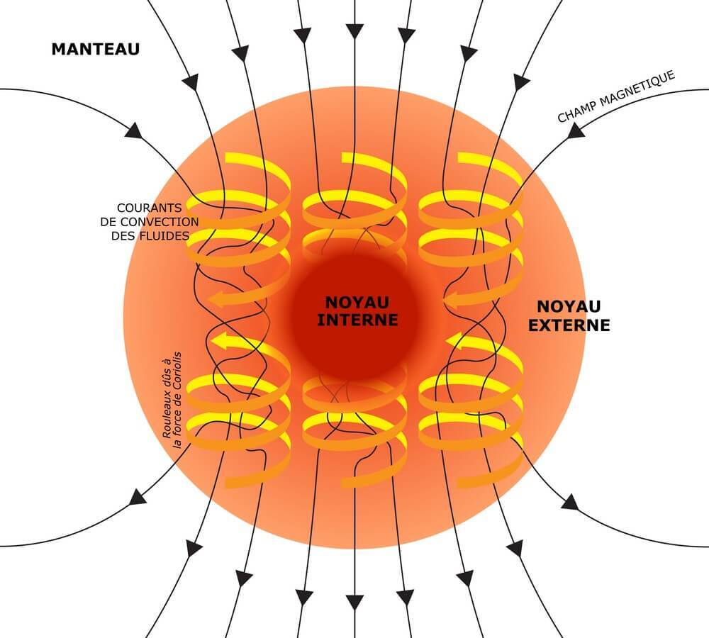 Per comprendere la dinamo terrestre è inoltre necessario essere in grado di individuare ciò che collega la rotazione della Terra su se stessa e il campo magnetico. In assenza di un campo magnetico, sappiamo che la forza di Coriolis (la forza responsabile di quel passo esitante quando si cammina in un vortice rotante) costringe i flussi (qui fluidi) a Organizzarsi in uragani e anticicloni – come nell’atmosfera – e si oppone ogni differenza lungo l’asse di rotazione, che per convezione fa sì che il nucleo si organizzi in enormi colonne parallele all’asse di rotazione.