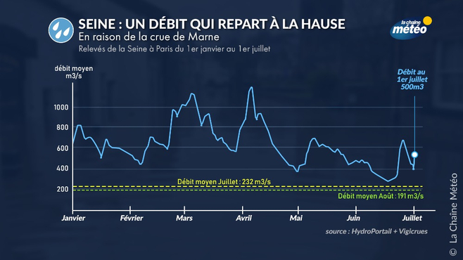 La Senna è un fiume con reazioni idrologiche lente, che raccoglie l'acqua da grandi affluenti, e la Marna è uno dei suoi tre affluenti principali (insieme all'Yonne e all'Oise). Questa primavera, il livello della Senna a Parigi è rimasto stabilmente alto nei mesi di marzo e aprile, tra i 3 e i 4 metri, dopo essere rimasto molto basso durante l'inverno. Periodi diversi di forti piogge nel periodo primaverile e all'inizio dell'estate hanno contribuito a frequenti flussi d'acqua, l'ultimo dei quali risale all'inizio di aprile. Più recentemente, il livello dell'acqua e la portata della Senna sono aumentati il 23 giugno (2,20 metri a Parigi), per poi diminuire nuovamente negli ultimi giorni. Ma di tanto in tanto Piogge e temporali nel fine settimanaIl livello sale a 50 cm entro 24 ore tra domenica e lunedì. L’innalzamento del livello dell’acqua è associato anche ad un aumento del flusso, cioè del volume d’acqua che circola tra le due sponde.