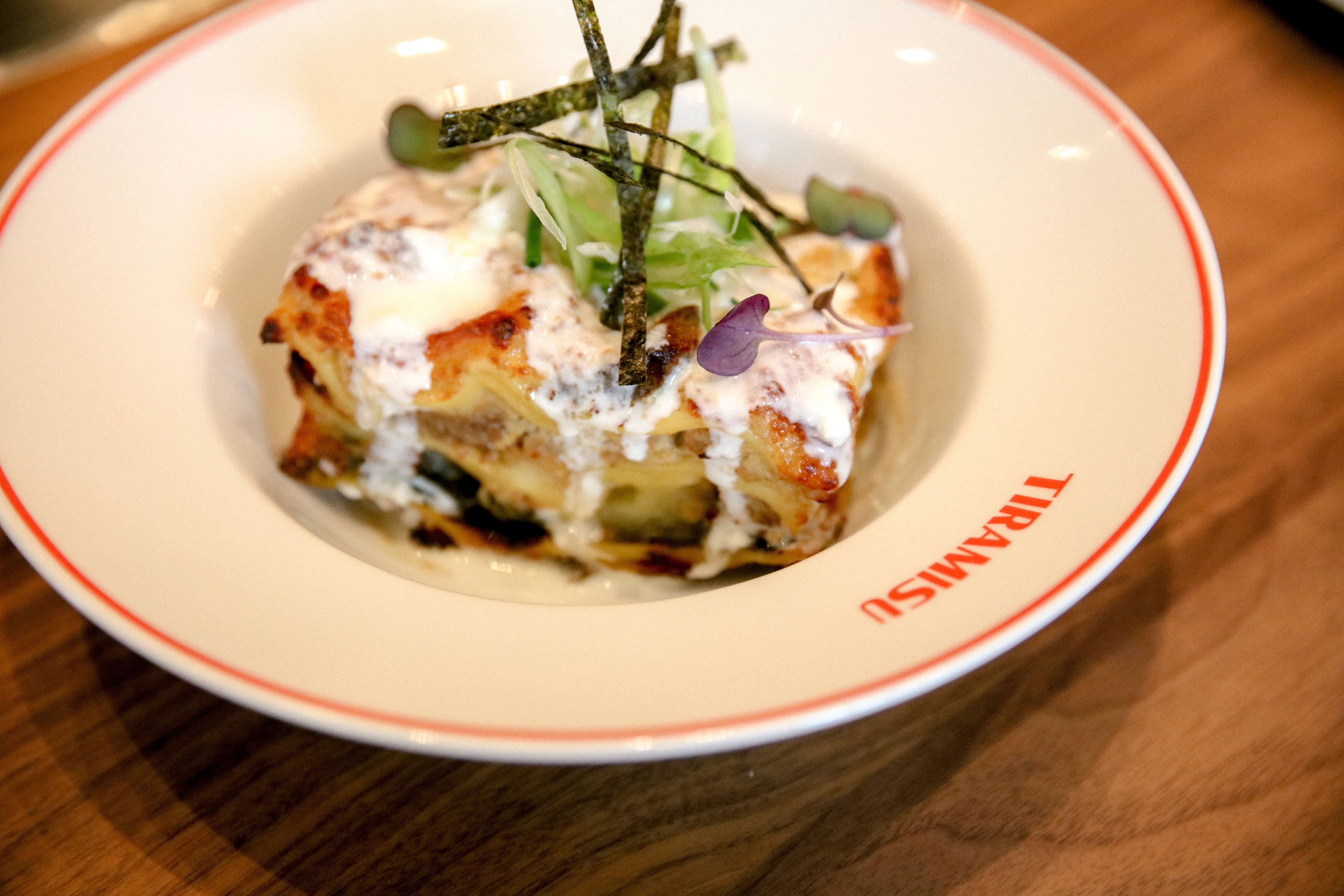 Inoltre, la lasagna Tokotsu è una delle creazioni più sorprendenti con i suoi ingredienti metà italiani e metà giapponesi: zabaione tallegio, vino bianco, pancetta ai funghi e sedano asiatico.